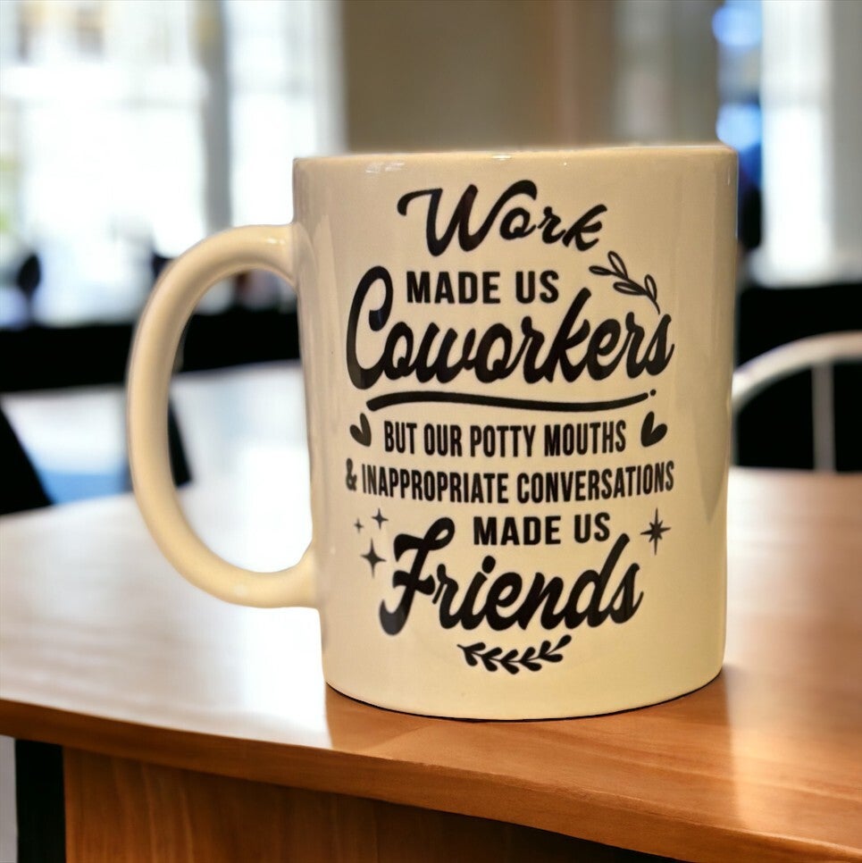 11oz mug with the saying, Work made us co-workers but our potty mouths & inappropriate conversations made us friends